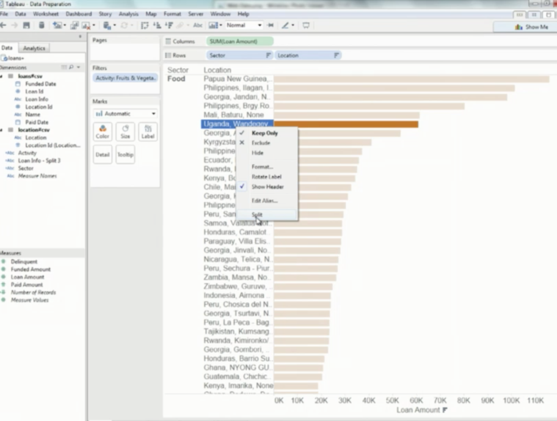 After selecting the split option, Tableau will take the Loan Info field and split it into 3 fields that you can rename accordingly.