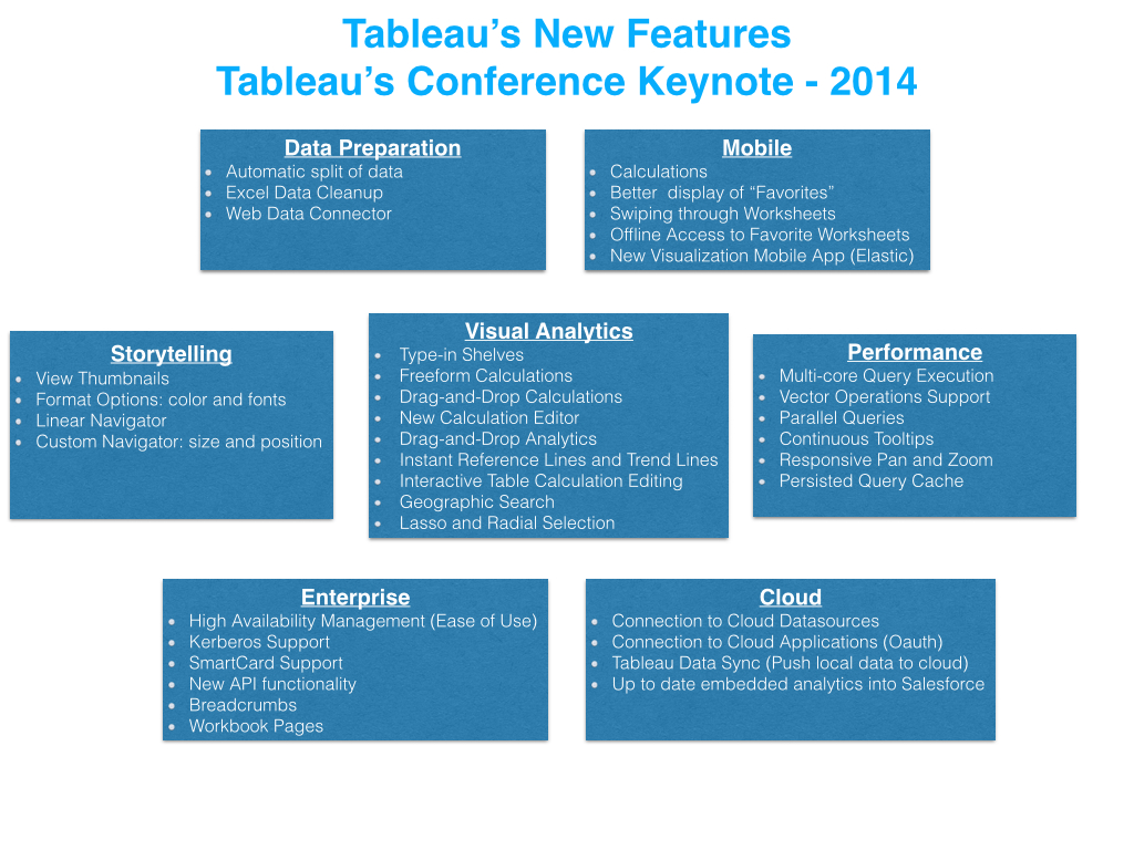 I hope you find this information useful. You can download a file with this summary: Tableau’s New Features – Keynote 2014