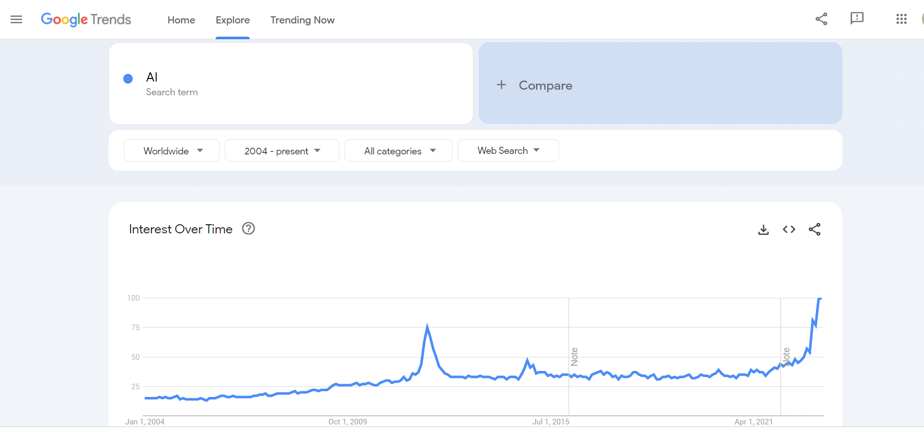 AI is everywhere and the hype around it is like nothing we have ever seen before. Just take a look at what Google trends show us about worldwide web searches for the word AI during the past 19 years. There was a peak in 2011 probably generated by IBM Watson’s winning Jeopardy and Apple’s launch of Siri – 2 extremely significant innovations at the time. But nothing compares to the levels of interest generated over the past few months for AI and Generative AI.