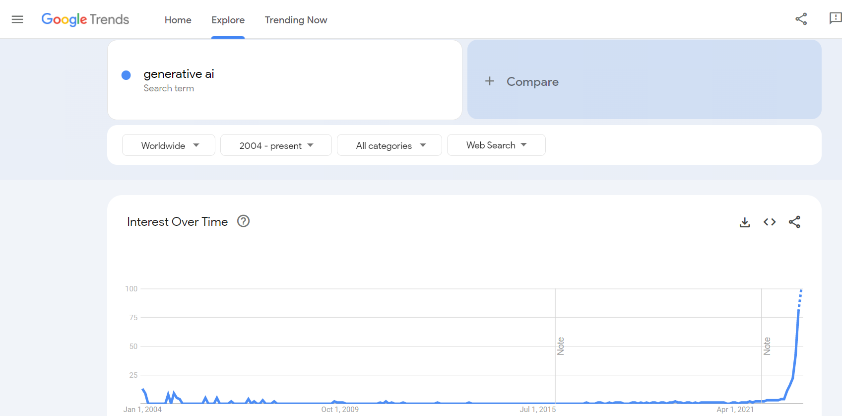 I have worked in the AI field for over a decade, and I have never seen AI technologies evolve with such speed and innovation like we are seeing now through Generative AI. The AI field is being revolutionized, and these new technologies will bring powerful new capabilities that can be turned into value for individuals, businesses, and society. And this is what Google trends show us about worldwide web searches for Generative AI during the past 19 years.